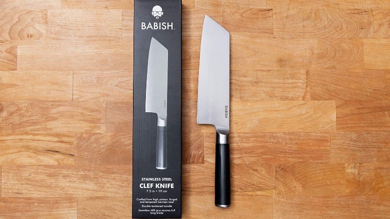 The Babish Clef Knife is part of the Babish Cookware line, which includes mixing bowls, tongs, whisks, measuring cups, and more designed in partnership with YouTube cooking sensation Andrew Rea, known for his show Binging with Babish.