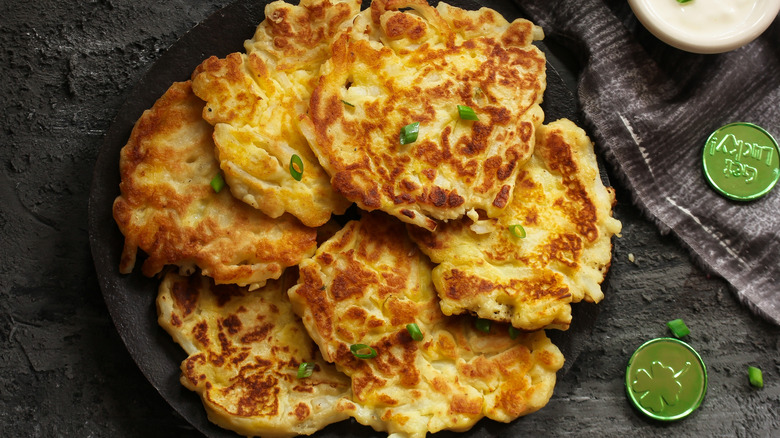 Tasting Table recipe developer Jaime Shelbert agrees that there are few Irish dishes more versatile than potato cakes, noting, "These parallel with your favorite Irish dish or alongside sauerkraut or any other cabbage dish. Popular toppings include sour cream, applesauce, caramelized onions, or savory jams."