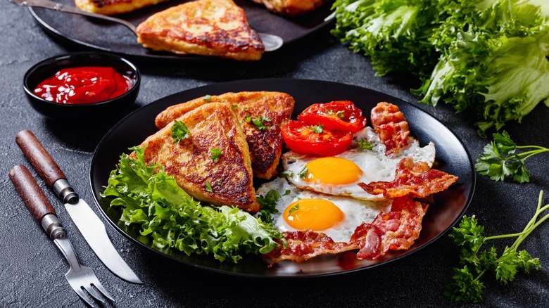 The answer is pretty much anything, according to Irish American Mom. A natural choice for breakfast in Ireland, the cakes are often enjoyed as part of a traditional fry-up, alongside bacon, sausages, eggs, mushrooms, and fried tomatoes. Or, you can dig into the cakes at lunch, serving them with pork chops, salmon, or ham.