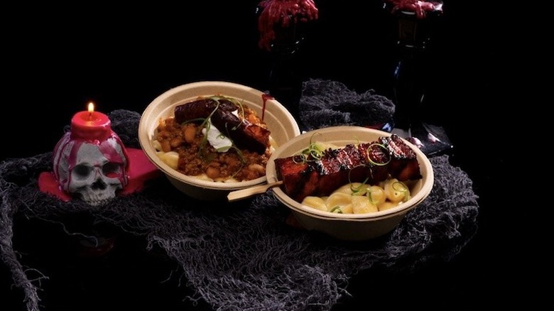 Burnt Offerings, named for the classic 1976 horror flick, is one of two macaroni and cheese bowls offered. The other option, the Sacrificial Remains Mac n' Cheese bowl, is chili mac n' cheese served with chorizo fingers. We're sure it's very good. But the Burnt Offerings bowl of white cheddar mac n' cheese topped with a char siu pork skewer, caught our eyes and our taste buds.