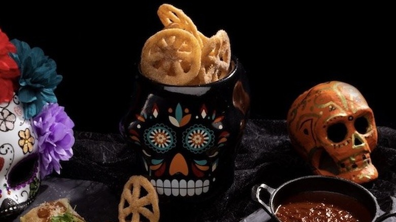 Those of you who are familiar with chicharrones might be wondering why in the world would anyone combine pork rinds with sugar and cinnamon. Don't worry — these chicharrones are meatless. They are made of deep-fried flour "cracklings," and are also one of the least expensive options on the Halloween Horror Nights menu, coming in at under $5. These sweet treats come served in a little cellophane bag with a sugar skull sticker on them. They look almost like slices of fried lotus root.