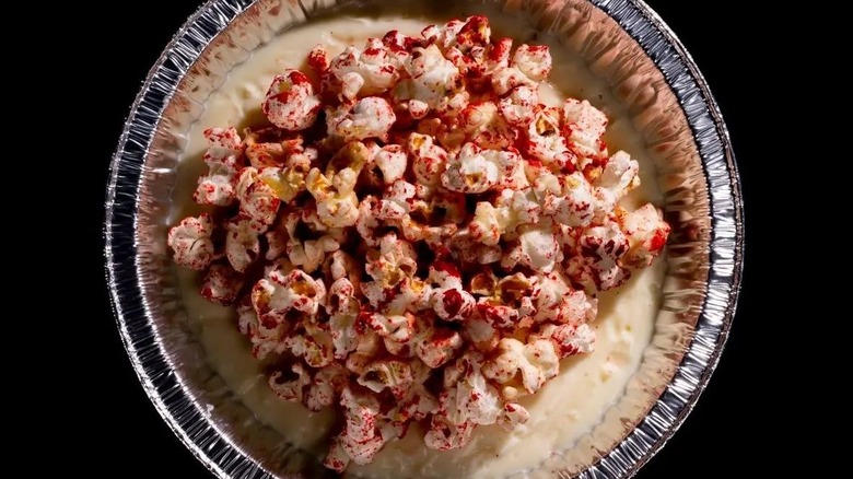 Described as "popcorn-infused custard topped with blood-spattered popcorn" and served in a foil plate reminiscent of the old stovetop popcorn pans, this seems like a great between-houses snack. But it falls short of expectations. The custard is somewhat tasty, but the consistency is more solid than you'd expect. It's more like a pancake made of flan — as if the custard was mixed with gelatin. We didn't really taste any popcorn flavor in the vanilla custard itself, you only got the popcorn flavor in the actual popcorn.