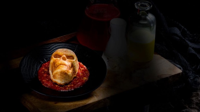 We were divided on it, ourselves, as one of us likes pepperoni and one of us does not. We loved the presentation. It's a neat, Insta-ready little skull. It's set in a bowl of pretty good marinara sauce and is stuffed with pepperoni and cheese. Imagine a cross between a pizza roll and a calzone, and you've got the idea. But you have to like pepperoni. If you do, you will like this. If you don't, you will find yourself wishing that they had a plain cheese pizza skull on offer as well as this, because the crust and the sauce are both tasty. Hopefully, Halloween Horror Nights will expand its selection of pizza skulls in the future. But for now, pepperoni pizza lovers can get their skulls in Grammercy Park.