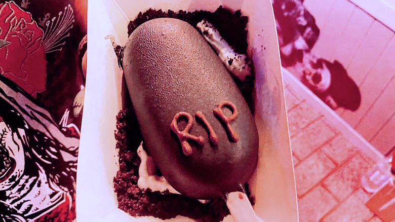It seems like cake pops have been showing up everywhere for the past few years. So it's not surprising that Halloween Horror Nights has them on the 2022 menu. The flavor of the cake pop is red velvet, and it's like Halloween magic (though the real reason for that deep dark red is actually just science).