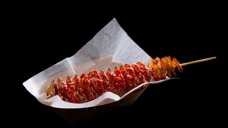 Universal Studio Orlando's Twisted Taters has long been a popular park food item, so it's not surprising that they made a few special options for Halloween Horror Nights. Twisted Taters are spiraled potatoes that have been cut thinly, deep-fried, and served on a skewer. For Halloween Horror Nights, all the regular Twisted Taters are available (seasoned salt, garlic parmesan, sour cream and chives, and ghost pepper), and there is also a "fiery" option made with crushed Hot Cheetos and ghost pepper. But the Blood n' Guts option is the one that is really a meal.