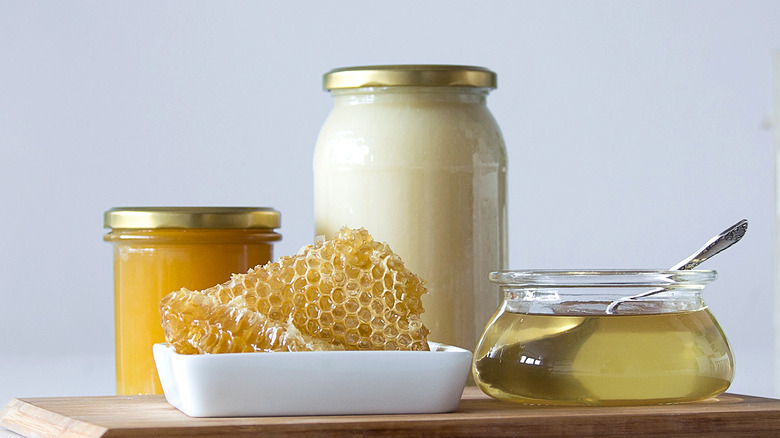 Hard-working honeybees are behind every jar of this deliciously vibrant sweetener. After reaching the hive, Live Science explains that bees regurgitate the nectar they've collected from flowers between themselves before depositing it into a honeycomb, where it's fanned and sealed with beeswax. Interestingly enough, the Seattle Times reports that honey can vary in color, aroma, texture, and flavor based on where the bees source nectar. That means that a malty buckwheat varietal will be unlike a buttery avocado, or medicinal eucalyptus varietal, which is something to consider when adding honey into recipes.