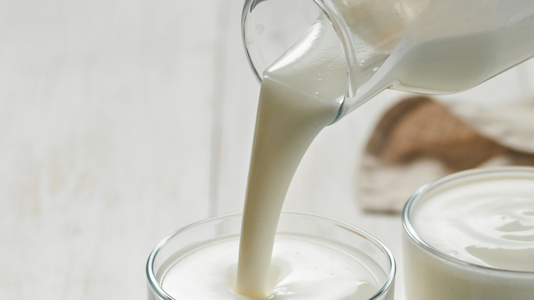 Buttermilk is a byproduct of the butter-making process, per Southern Living. As the fat starts to come together in the center of the vat, the liquid that separates is left at room temperature to culture with naturally occurring bacteria and yeast before being bottled and stored as buttermilk. Although buttermilk is much thinner than Greek yogurt, there is some continuity in tanginess between the two. Buttermilk should be substituted for Greek yogurt for recipes with great care and adjustments to other liquid ingredients to ensure the moisture in the batter or dough is appropriate. The thinness of the buttermilk won't provide the fattiness and texture needed for a yogurt sauce or a dip, so you are better off using other types of dairy products if you're whipping up tzatziki.