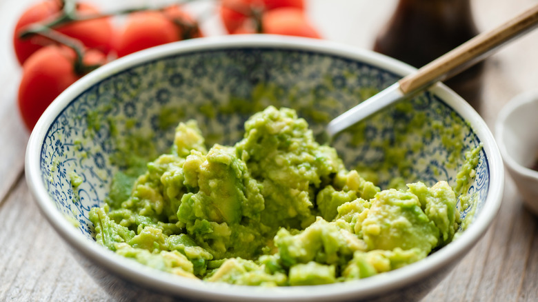 When substituting avocados and Greek yogurt, you should opt for a 1-to-1 ratio (per Treat Dreams). Pureeing your avocados in a food processor or blender before measuring will ensure the best substitution results rather than eyeing up a whole avocado versus a cup of Greek yogurt. If you want a distinct, yogurt-like tang, try adding a bit of lemon or lime juice to your mashed avocado before mixing it with other ingredients. If you have spare avocado at the end of your cooking, you can opt to make a quick guacamole or use the mashed avocado for a fatty boost in a smoothie.