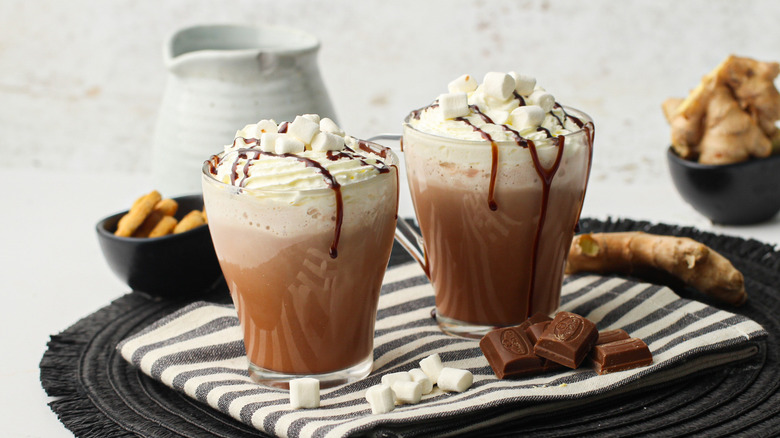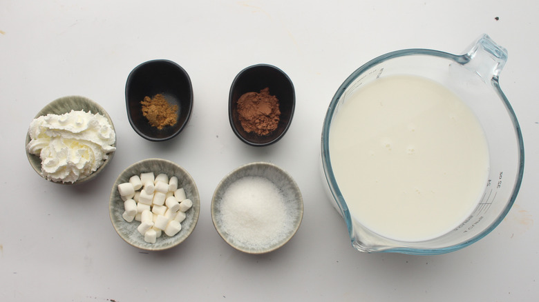 To make this delectable drink, you'll need whole milk, unsweetened cocoa powder, sugar, ground ginger, whipped cream, and mini marshmallows.