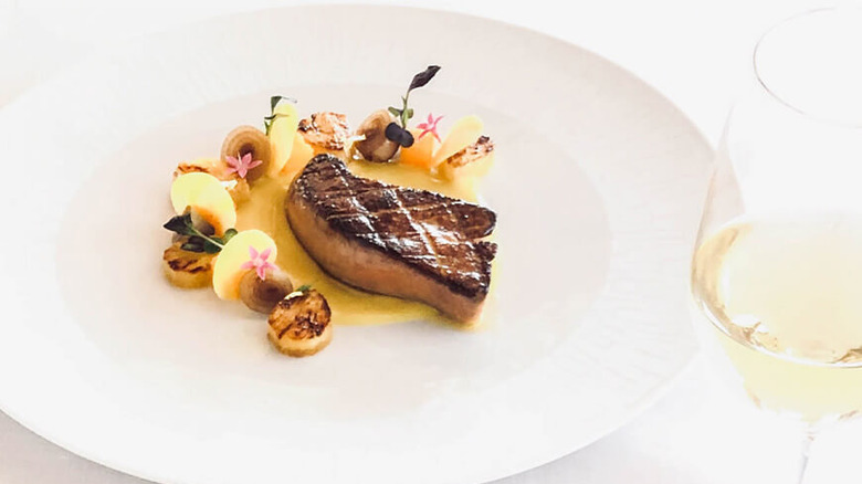 The restaurant offers an eight-course dégustation menu or a four-course amuse-bouche. The dégustation menu includes an amuse-bouche, foie gras de canard, seafood courses, fine meats, cheeses, and dessert. The menu is dynamic and varies in terms of ingredients and combinations. However, one constant is the original combination of ingredients and the subtle hint of French cuisine in every dish. For example, duck foie gras is a very appreciated ingredient in the La Mer menu, used both as an amuse-bouche and as a main course ingredient. Some examples of original combinations are the duck foie gras amuse-bouche, served with a Kahlua and coconut gelée, and the filet of beef with foie gras.