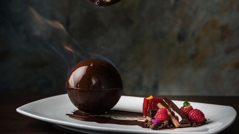 The star of the meat menu is the hand-carved roast duck, served with a flour tortilla, sweet apricot chili, and hoisin miso. The absolute highlight of the menu is the chocolate sphere dessert, a spectacular dish that looks like it belongs on a cooking show. Just as the name says, it is a chocolate sphere filled with chocolate ice cream, whipped cream, and chocolate ganache and served flambéed — which means that the flame melts the chocolate and mixes the ingredients inside for a heavenly bite.
