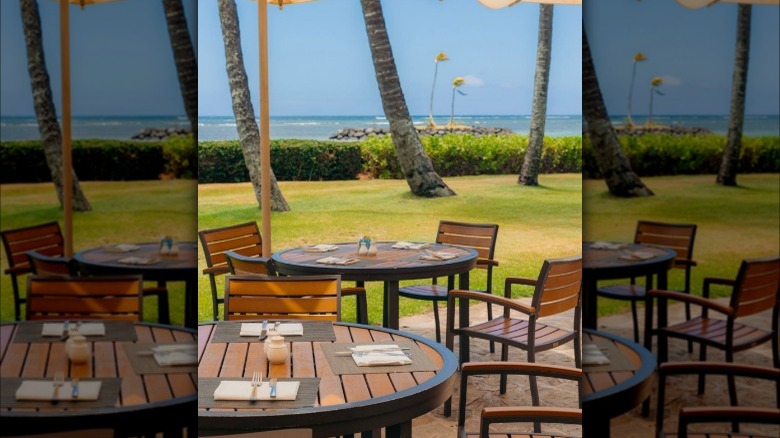 Bali Oceanfront, located in the Rainbow Tower of the Hilton Hawaiian Village, is another venue that offers the oceanside dining experience. The restaurant sources food from local fishermen, farmers, and ranchers. The interior is decorated in neutral and earthy tones, highlighting the garden's spectacular views of palm trees and the ocean.
