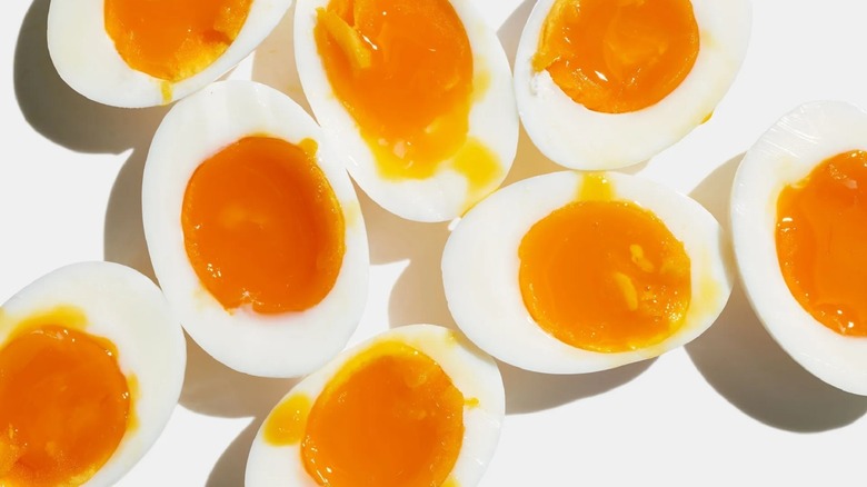 Okay, the eggs are happily relaxed in a hot tub of water. Now what? Well, that all depends on what you want the end result of not just your yolk, but also your white to be. Eggs are high in protein, and when heated, the proteins unfold and begin linking to other proteins, which cause them to become hard (via How Stuff Works). So, it would stand to reason that the longer you cook, the harder the egg will get.