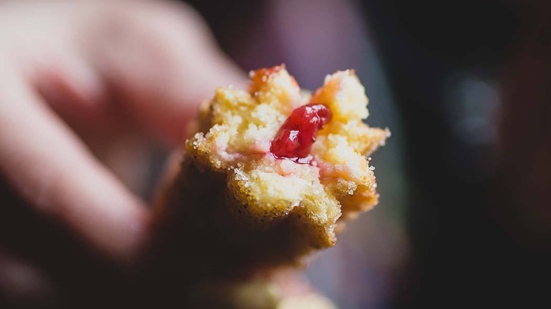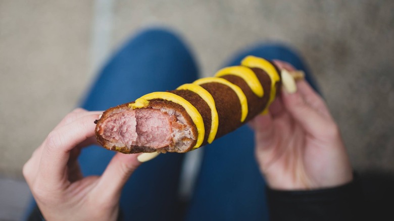 The cornbread coating contains boysenberries, which adds an interesting element that you've likely never experienced while enjoying a corn dog before. Along with providing a layer of sweetness to the already slightly sweet batter, there's also a touch of acidity there as well. Combined with the savory profile of the hot dog itself, everything comes together in a harmonious bite. (We recommend adding a squirt of mustard for a touch of heat.) This is a snack you absolutely have to try if you go to Knott's Berry Farm (you can find it over at Strictly-On-A-Stick). After all, where else are you going to find something like this?