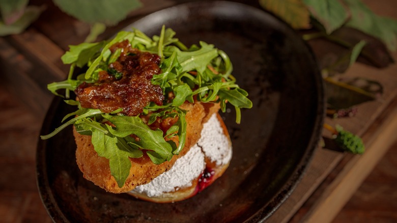 The Knott's Berry Farm Boysenberry Festival is the place to be when you want to enjoy savory boysenberry-infused eats. One of the absolute best of these dishes is the boysenberry-filled donut open-faced chicken sandwich. Is there a lot going on here? Absolutely. But does it all come together in a delicious sandwich that incorporates the best of sweet and savory flavors? Definitely. The donut has a distinct sweetness to it that's tempered by the addition of the boysenberries. The breaded chicken adds a much-needed savory component. but to make things even more interesting, there's an addition of bacon jam (once again mirroring the perfect marriage of sweet and salty flavors) along with some arugula, which is much needed considering the heaviness of the rest of the dish.