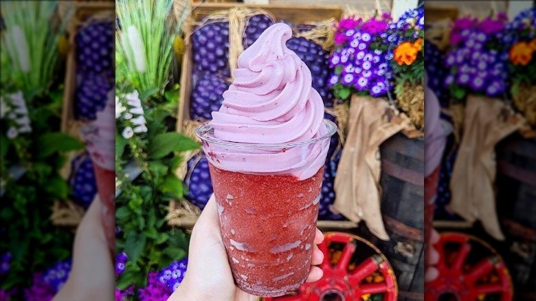 There is no question that Orange County, California institution Knott's Berry Farm offers all the rides and attractions that you look for in an amusement park, but it's also a celebration of one of the greatest fruits to ever bless humans with its presence: the boysenberry. According to Knott's Berry Farm's website, Walter and Cordelia Knott purchased their farm in 1920 and decided to try to cultivate a friend's new berry plant — 100 years later, it's clear they've been successful. Now, you can't find boysenberries everywhere, but you will be lucky enough to encounter a lot of them when you take a trip to Knott's. Sometimes, they take an expected form — you're not going to find any shortage of pies and other desserts here. However, boysenberries show up in unexpected ways that will change the way you think about fruit.