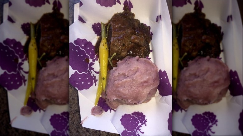 This is one you're simply going to have to taste to believe — a fruity twist on an all-time classic. It's Knott's Berry Farm's pot roast with boysenberry mashers. What are mashers, you ask? Just mashed potatoes, only these are blended with boysenberries. It gives the dish a purple hue that's probably unlike any other kind of mashed potatoes you've had before in your life.