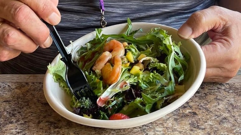 According to Theme Park Insider, the spring fling salad with shrimp and boysenberry vinaigrette was a new menu item at the 2022 Boysenberry Festival, and it's something we hope to enjoy during future fests. All too often at amusement parks, you absolutely stuff yourself full of heavy, greasy food. That's great if your stomach can handle it, but there are plenty of people out there who are just craving some veggies and something on the lighter side after a day or two of roller coaster riding. That's where this salad comes in. The shrimp is the star of the show, but it's complemented by an assortment of greens that will have you feeling your best.