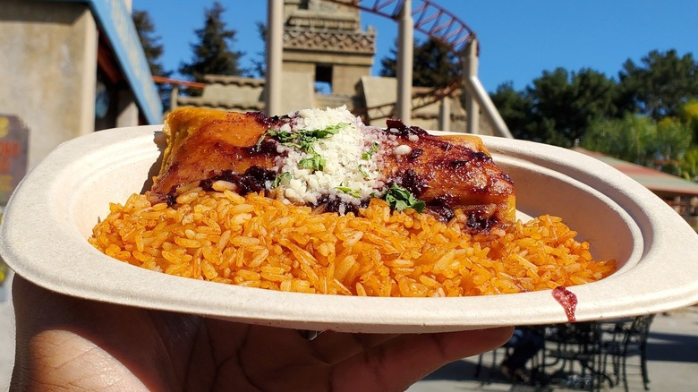 There are plenty of expected boysenberry dishes at Knott's Berry Farm, but the park really pull out all the stops for some of its festival offerings. Those who visited during the 2022 Boysenberry Festival had the opportunity to get their hands on a tasty plate of tamales topped with boysenberry sauce (via NBC Los Angeles). The tamales themselves are delicious with their soft but firm texture and luscious filling. But the real magic comes in with the sauce.