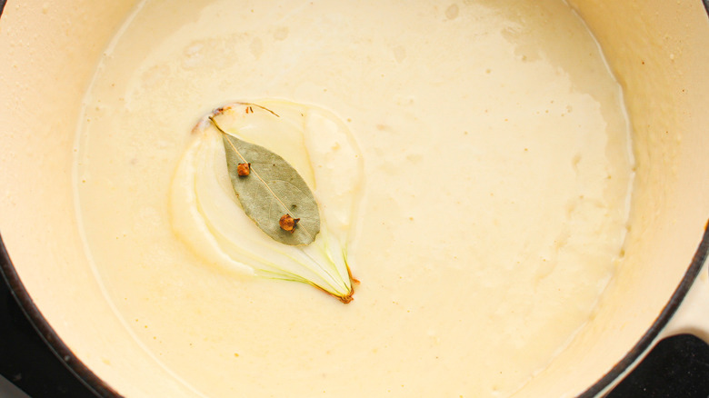 Traditionally béchamel is made with just three ingredients that include flour, butter, and milk. However, Olayinka uses a special technique that gives her sauce extra flavor. She adds an onion pique to her recipe, which sounds difficult, but is actually very simple to do. "It makes the dish feel much more gourmet than it actually is," she explained. "Also it adds great flavor without being overwhelming." All you have to do is slice the onion in half, remove the layers from the piece you'll be using, and then pierce the bay leaf into the onion.