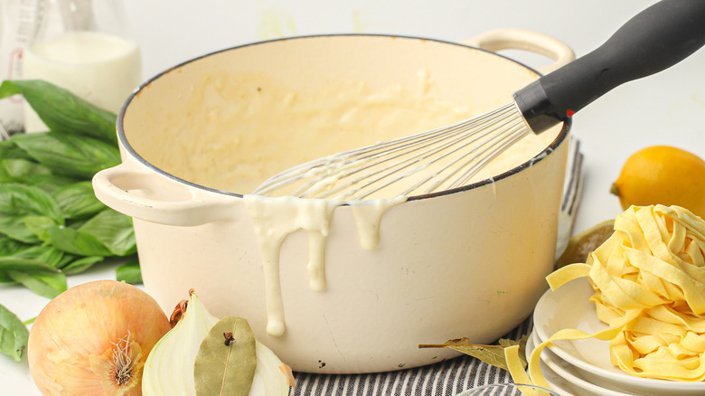Béchamel is considered the mother of sauces in French cuisine, which typically has a white and creamy consistency that's packed with flavor. It traditionally pairs well with roast chicken and different types of pasta, but can also be added to casseroles or even a soufflé. Our Tasting Table recipe developer Susan Olayinka said it's the perfect addition for many different meals. "Try it on top of grilled chicken, fish, or veggies," she suggested. "It would also be delicious on a savory crepe or as a dipping sauce for breadsticks. Lasagna, mac and cheese, and quiche would all be great with this sauce as well."