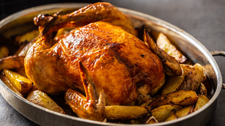 The outlet explains that slathering a chicken with mayo before roasting helps insulate the meat and keep it moist while also promoting even browning of the bird, which results in deliciously crispy skin. And while plain mayonnaise achieves this task nicely, the chicken comes out even better if you've got two minutes to spare and can mix some tasty seasonings — such as garlic, lemon zest, and mustard — into the spread before brushing it across the chicken. So the next time you're roasting chicken, try swapping mayo for the butter you'd ordinarily squish across the bird and delight in a fowl that boasts juicy meat and crunchy, deliciously seasoned skin.