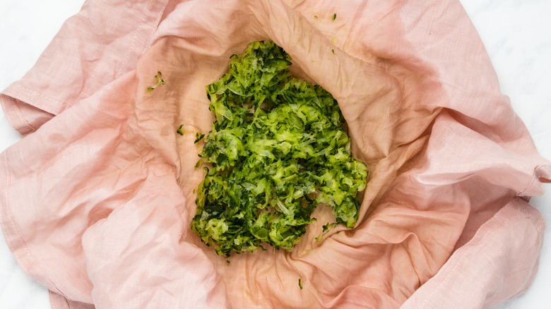 To kick things off, you'll want to first grate the cucumber — it'll be quickest if you use a large box grater. Next, place the grated cucumber in a clean cloth and squeeze out as much excess moisture as possible.