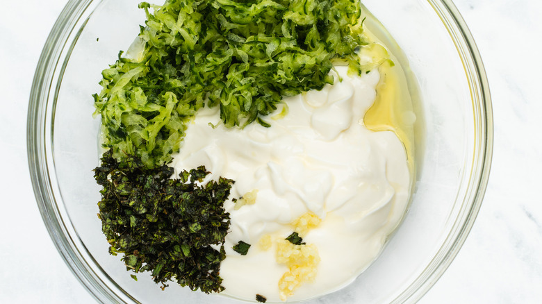 Once you've squeezed out that excess moisture, go ahead and put the grated cucumber into a large bowl, along with the Greek yogurt, garlic, lemon juice, olive oil, mint, and salt. Give everything a good stir so that the ingredients are evenly incorporated.