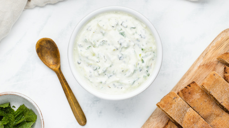 Tzatziki sauce is an integral part of Greek cuisine, and its best known for its creamy, cucumber-infused flavor. You could slather some on a pita, dip gyro meat in it, or enjoy it as a veggie dip. While you may be tempted to buy a tub of tzatziki from the store, it really does taste best when it's homemade — and, as it turns out, it's not too hard to make it right in your own kitchen! "This sauce is so fresh, creamy, and herby," recipe developer Catherine Brookes says of her homemade version. "It's made using simple ingredients and super versatile too."