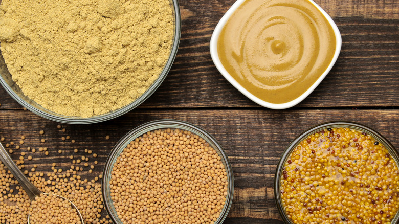 Essentially, mustard is made by mixing whole, cracked, or crushed mustard seeds with a liquid like vinegar, water, or beer. Although seed variety can affect a mustard's heat, the type of liquid used to saturate crushed grains can make an even bigger impact as it can slow or accelerate the transformation of glucosinolates into spicy-tasting isothiocyanates (via America's Test Kitchen). Since acidic liquids can prevent spicy molecules from forming, this leads to less piquant mustard, whereas water can make for a more fiery sauce.