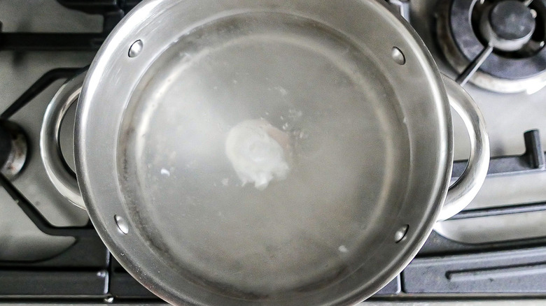 You might want to gather up the necessary kitchen tools, now, too. In addition to a pot to boil the water, you'll need the aforementioned strainer (a fine mesh one) plus a whisk and a slotted spoon. If you have any ramekins to hand, you can put one of these to use, as well. No ramekins? A mug will do just fine. As to what you're using it for, Dalton says putting the egg into such a container before sliding it into the water "helps the cooking process and keeps the poached eggs perfect."