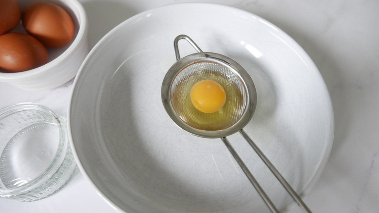 - Crack an egg into a fine-meshed sieve and strain it to drain any excess moisture in the white. Put the egg into a ramekin or a cup.