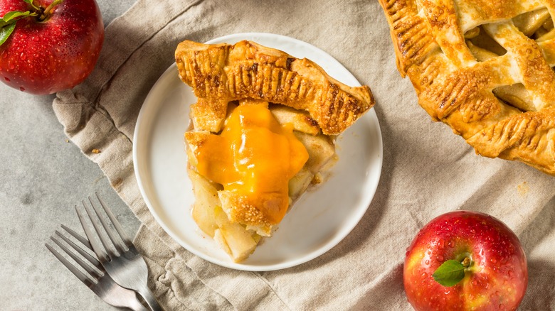 Apple pie and cheese being "a thing" may surprise even those who've been eating for many decades. Apparently, it's not such a revelation if your roots dig deep into the American Midwest, New England, or the apple-growing state of Vermont. The debate over pairing apple pie with cheese may have been raging for centuries, but the practice has been clearly documented in print for at least 100 years. Coverage by the Los Angeles Times in 1998 notes the combination cropped up in 1950s cookbook recipes and nods to some semblance of apple pie and dairy pairings dating back to the 1600s and 1700s. Perhaps the dairy part morphed into cheese, but even food historian Charles Perry, who penned the Times article, failed to make an informed declaration on that.