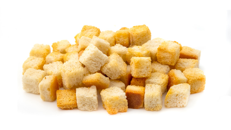A crouton, as MasterClass puts it, is made by taking small pieces of bread, seasoning them, and then cooking them, typically via baking or sautéing. Sure, you can use fresh bread, but it won't have that texture, that crispy bite that we all crave in croutons. To that, it's best to use days-old sourdough, Italian, or French boule bread, per Taste of Home, though you can also get creative and try your hand with pita bread or cornbread.