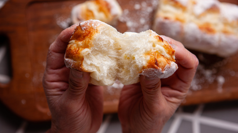 All you have to do is take some bread and tear it away! You're aiming for small pieces that will (obviously) look like the size of a crouton. And if they don't look perfect, pat yourself on the back, because croutons look and taste better when their flaws are showing. After the tearing process is over, proceed as normal with your favorite crouton recipe. MasterClass suggests seasoning the bread pieces with olive oil, salt, and pepper, and then baking them on a sheet pan for up to 10 minutes at 375 degrees Fahrenheit.