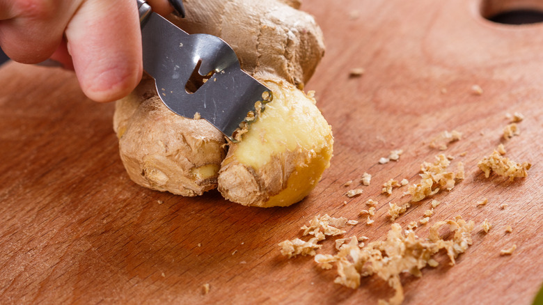 If you're a ginger novice, you might pick up a piece of ginger at your store and wonder, "how the heck do I peel this?" Your first inclination may be to reach for your vegetable peeler, but soon you will realize that ginger is much knobbier than a potato or a carrot — so you'll end up hacking away at most of the ginger's flesh to get the peel off. A paring knife would not work for the same reason — plus, you probably don't want to cut off your skin in the process. The best way to peel ginger, instead, is nothing fancier than a metal spoon.