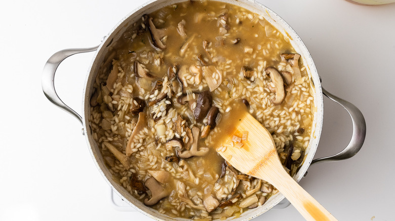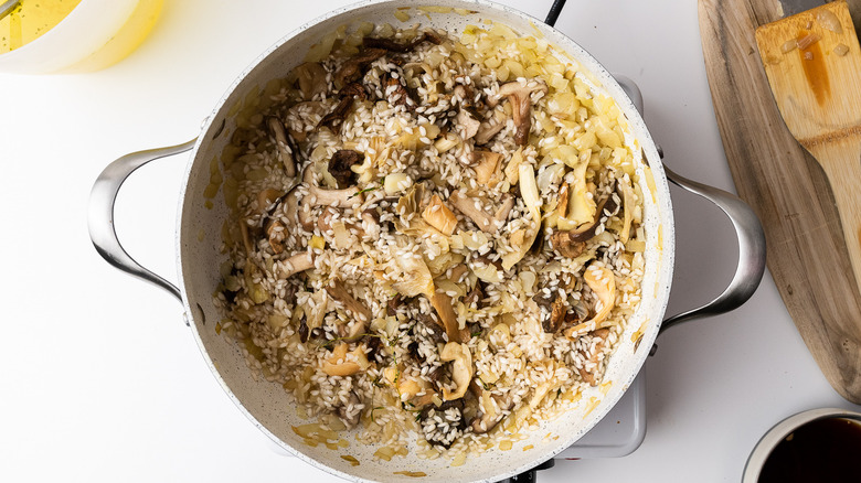 - Add the arborio rice to the pan and stir gently for 1 to 2 minutes.