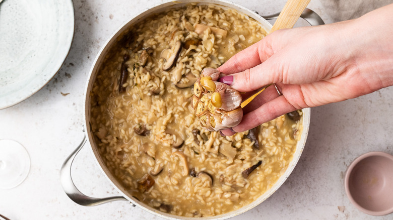- Squeeze the roasted garlic bulb to remove the individual cloves. Lightly mash them and stir them into the risotto.