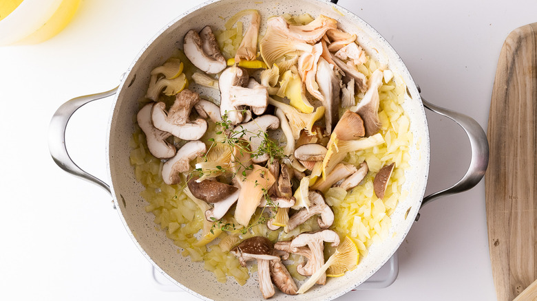 - In a large, flat-bottomed pan, heat up the remaining olive oil with 1 tablespoon of butter. Add the finely chopped onion and gently sauté for 4 to 5 minutes. Add the other half of the mushrooms to the pan, along with the thyme, and then cook for another 4 to 5 minutes until everything is softened.