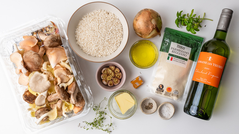 Gather the ingredients for this mushroom and roasted garlic risotto