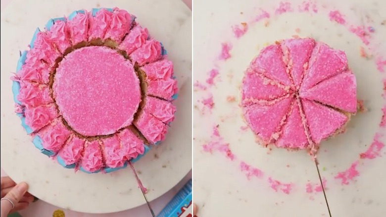 Now, in the interest of full disclosure, it's worth noting that the slices from the outer ring(s) will not be equal in size to the slices from the center, as one Instagram user noted in a comment to Funfetti's aforementioned Instagram post. Another commenter pointed out that slices from the perimeter may have more frosting than interior slices, noting "cake is literally just a socially acceptable vessel for the frosting for me." Of course, some will be happy to see less frosting, so a host might use that to advantage by serving the interior versus exterior slices on separate serving dishes, and letting the guests decide.