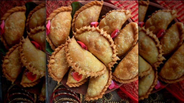 If you love celebrating Diwali, which this year kicks off on October 22 and concludes on October 26 (via Mint), then you already know the holiday offers up dozens of traditional Indian sweets, from the cashew fudge known as kaju katli to funnel cake-like jalebi soaked in saffron sugar syrup (via Dassana's Veg Recipes). It can be hard to choose a favorite Diwali dessert, but Serious Eats contributor Mithila Phadke, who grew up celebrating the holiday with her family in Mumbai, makes a strong case for karanji, a crimped half-moon dumpling made from flour and ghee, stuffed with either fresh or desiccated (i.e., dried and finely shredded) coconut meat, and fried in vegetable oil or ghee (via Dasana's Veg Recipes).