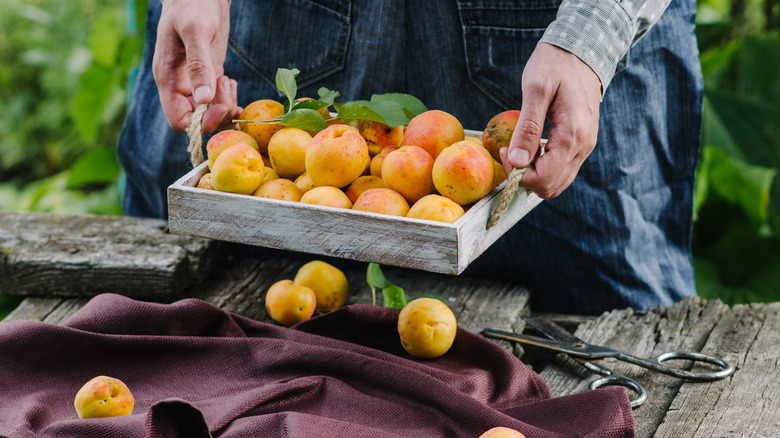 The result is a sweet and tart-tasting fruit with soft and velvety skin, ranging from pale yellow to deep orange (via Spruce Eats). Unfortunately, apricots spoil easily, which is why they're so often preserved. Farmers must pick fresh ones before they're fully ripe to reduce the risk of damage during transportation. On the other hand, canned apricots keep quite well, so they can be picked when completely matured. According to Specialty Produce, commercial types of apricot include the Blenheim, Moorpark, Royal Rosa, Sungold, and Autum Royal.