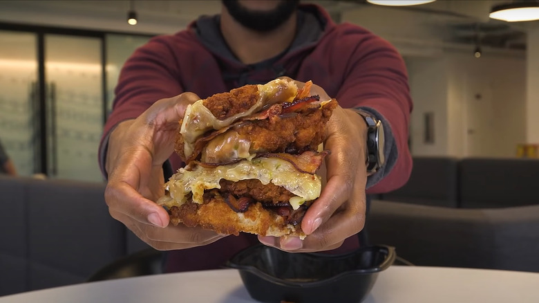 You won't see it listed on the regular menu, but this Double Double Down from Chick-Fil-A's secret menu gives KFC a run for its money. The sandwich consists of three chicken patties — two of which are the buns — as well as lettuce and tomatoes (via Eat This, Not That). Per Insider (via YouTube), you can order it with as many as four patties and add pepper Jack cheese and bacon, so it resembles the KFC version.