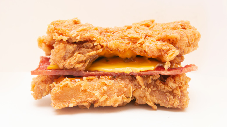 Back in 2010, when KFC first announced it would be releasing a bacon and cheese sandwich with two pieces of fried chicken as the bread, most people thought it was an April Fool's joke (via CNBC). However, much to everyone's surprise, the Double Down ended up being a real thing and even stayed on the menu longer than its intended limited-time run (via CNN Business).