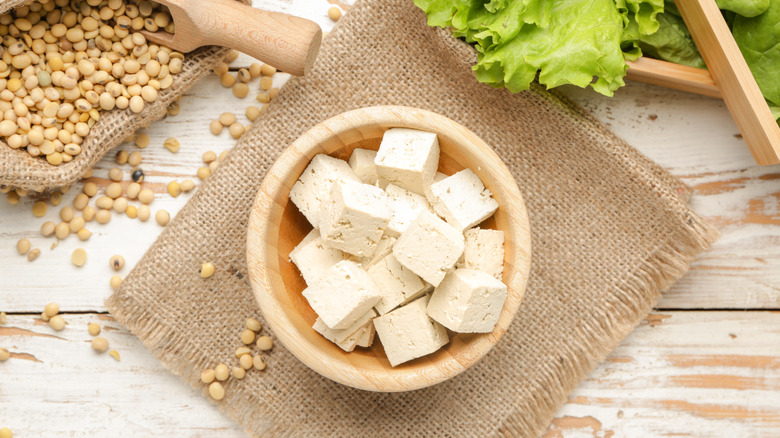 Tofu is made from soybeans. It's a delicious protein option for entrées and can serve as an egg substitute in baking recipes. Tofu can be a vehicle for almost any flavor and makes an excellent breakfast scramble. It comes in various forms, such as extra firm, silken, regular, fresh, and prefried, so you can undoubtedly find the perfect option to fit any of your culinary needs.