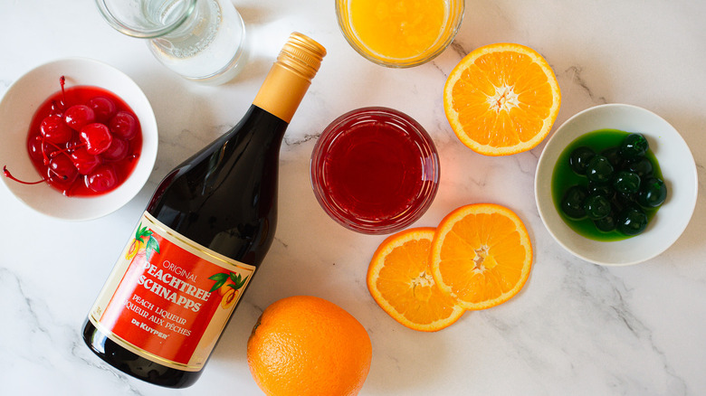 For this cocktail, you will need vodka, peach schnapps, an orange, cranberry juice, ice cubes, and two-toned maraschino cherries.
