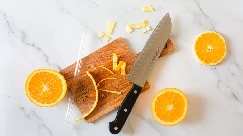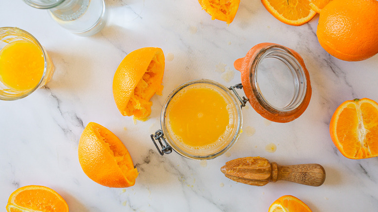 We wanted to go beyond store-bought orange juice and show you what a difference freshly squeezed orange juice can have on your drinks. Take one large orange and cut it in half widthwise. Cut off a slice (with the peel on), about 1-inch in thickness, and set it aside. Squeeze out the juice from the remaining orange. Measure out 2 ounces and set it aside.