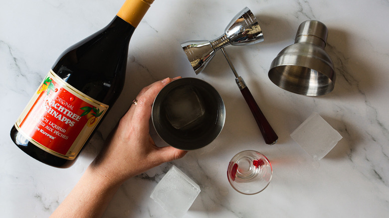 - Add the vodka, peach schnapps, orange juice, and cranberry juice to a shaker with ice.