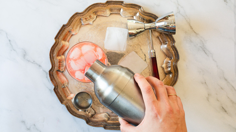 Strain the shaken cocktail through a cocktail strainer into a whiskey tumbler glass filled with fresh ice.